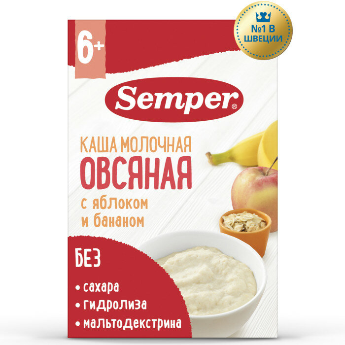 Купить Каша молочная Semper Овсяная с яблоком и бананом без добавления сахара детская, с 6 месяцев, 180 г