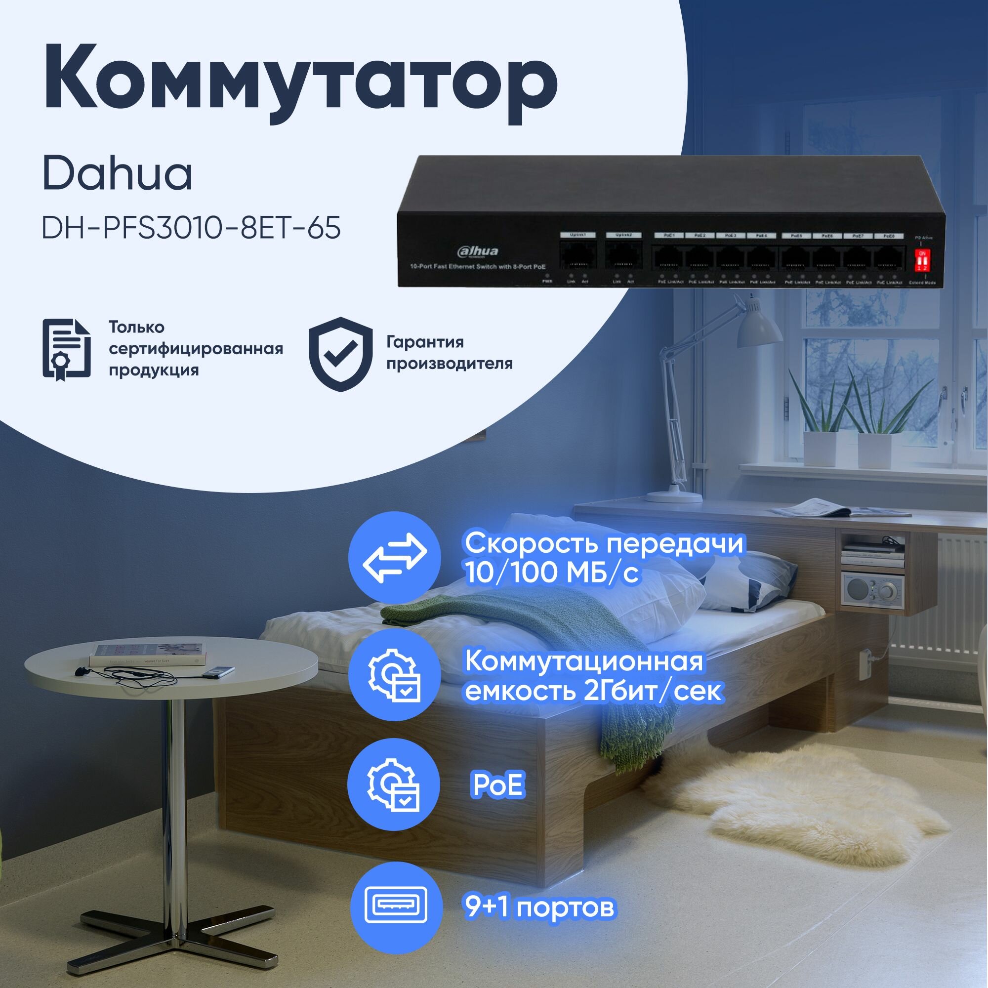 10 портовый с 8-РОЕ коммутатор Dahua DH-PFS3010-8ET-65