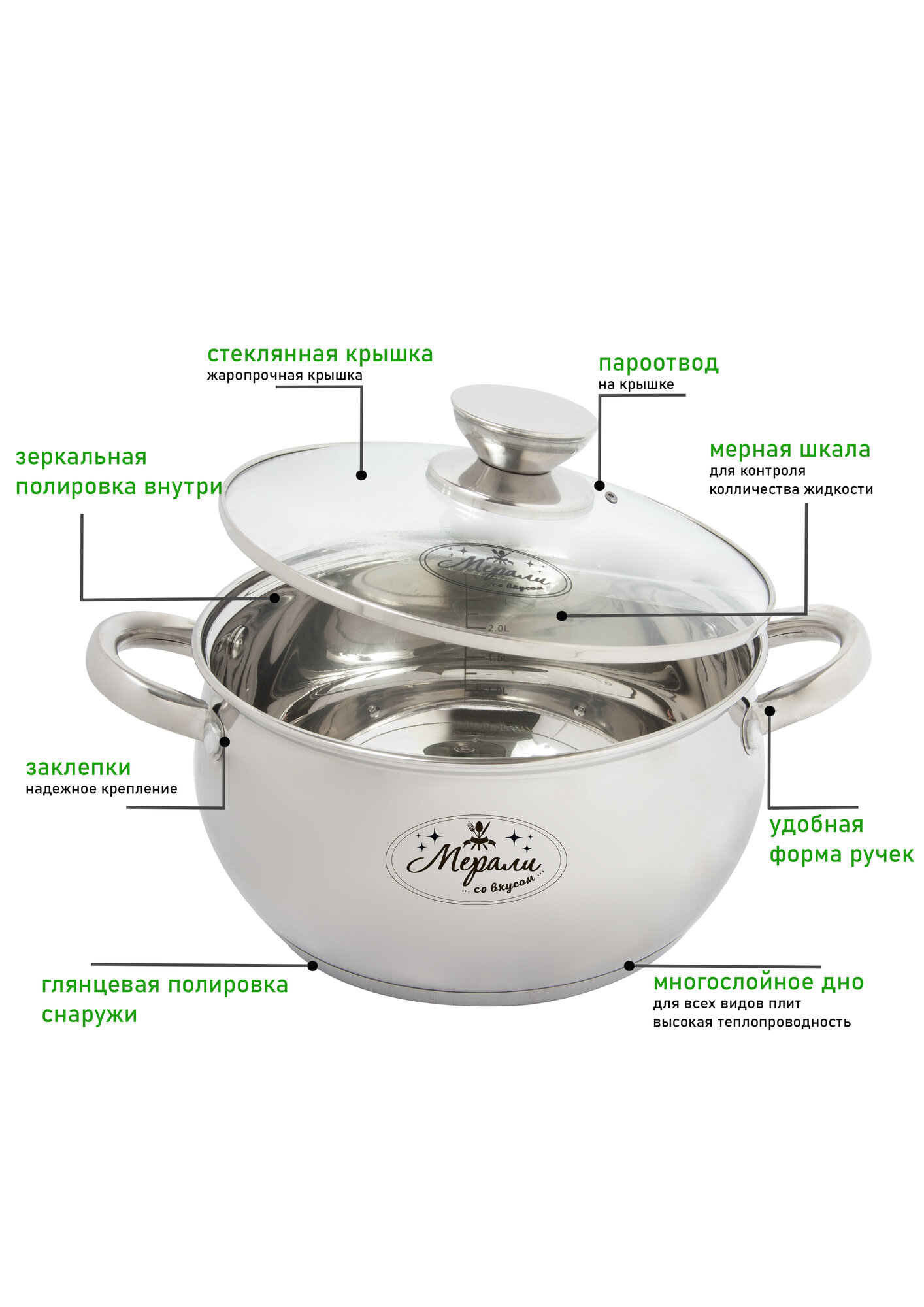 Кастрюля с крышкой Мерали 2 литра из нержавеющей стали для всех видов плит