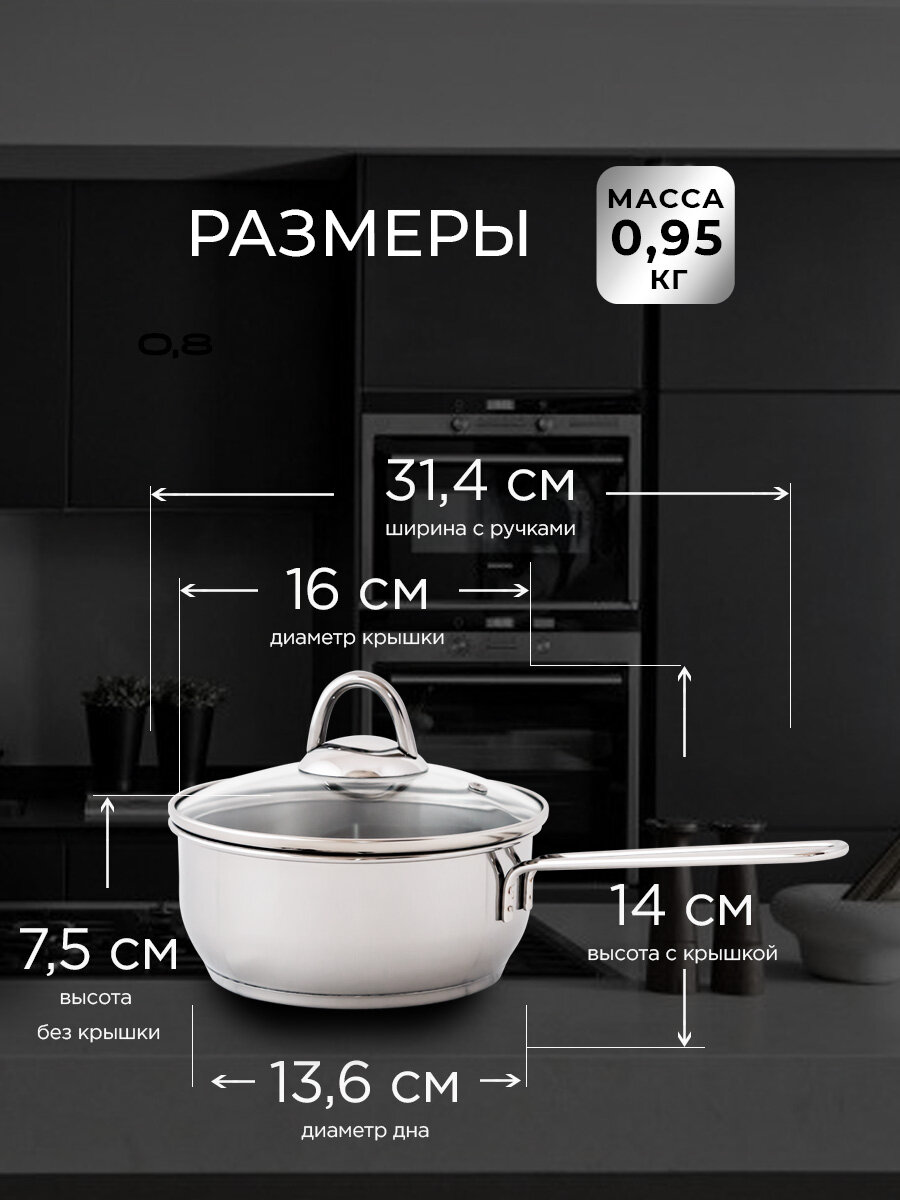 Ковш для кипячения молока из нержавеющей стали "Классика-Прима" 1л, д17см, h7см, ТРС-3, стеклянная крышка, прутковая металлическая ручка