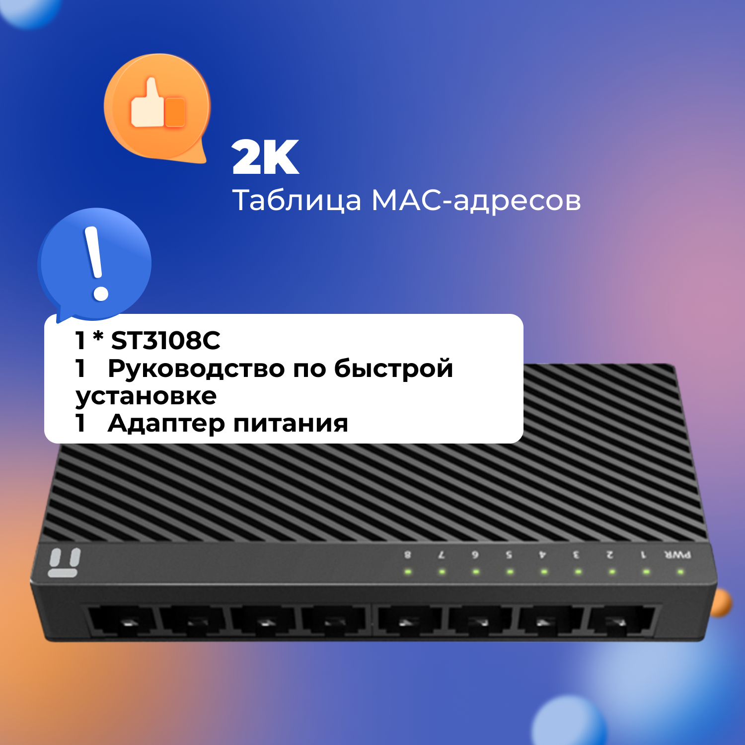 Netis ST3108S Коммутатор неуправляемый, 8 портов, 8х100 Мбит/сек, настольный, пластиковый корпус