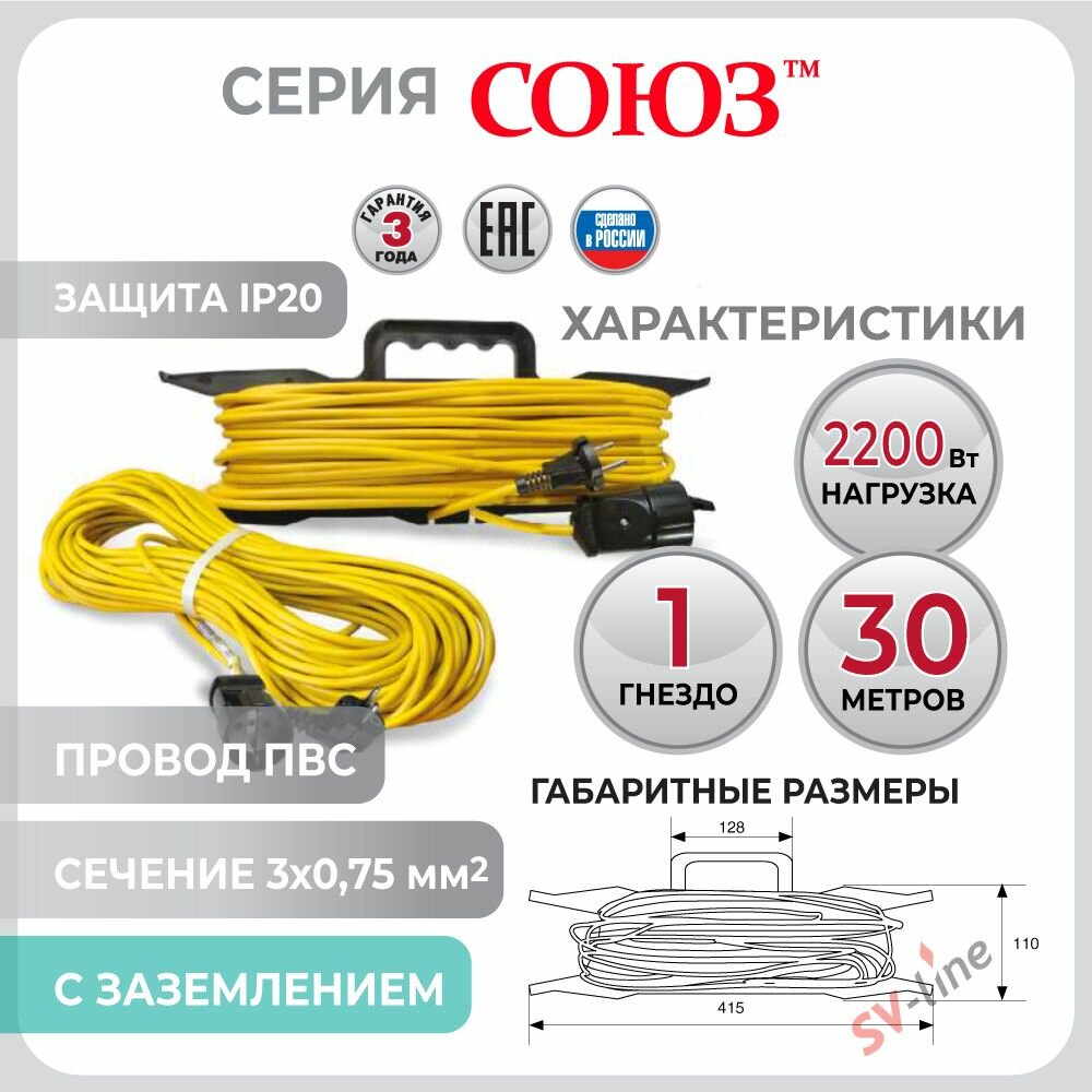 Удлинитель-шнур на рамке 1х30м без заземл. 10А IP20 2.2кВт Союз 481S-5203 ( 1шт. )