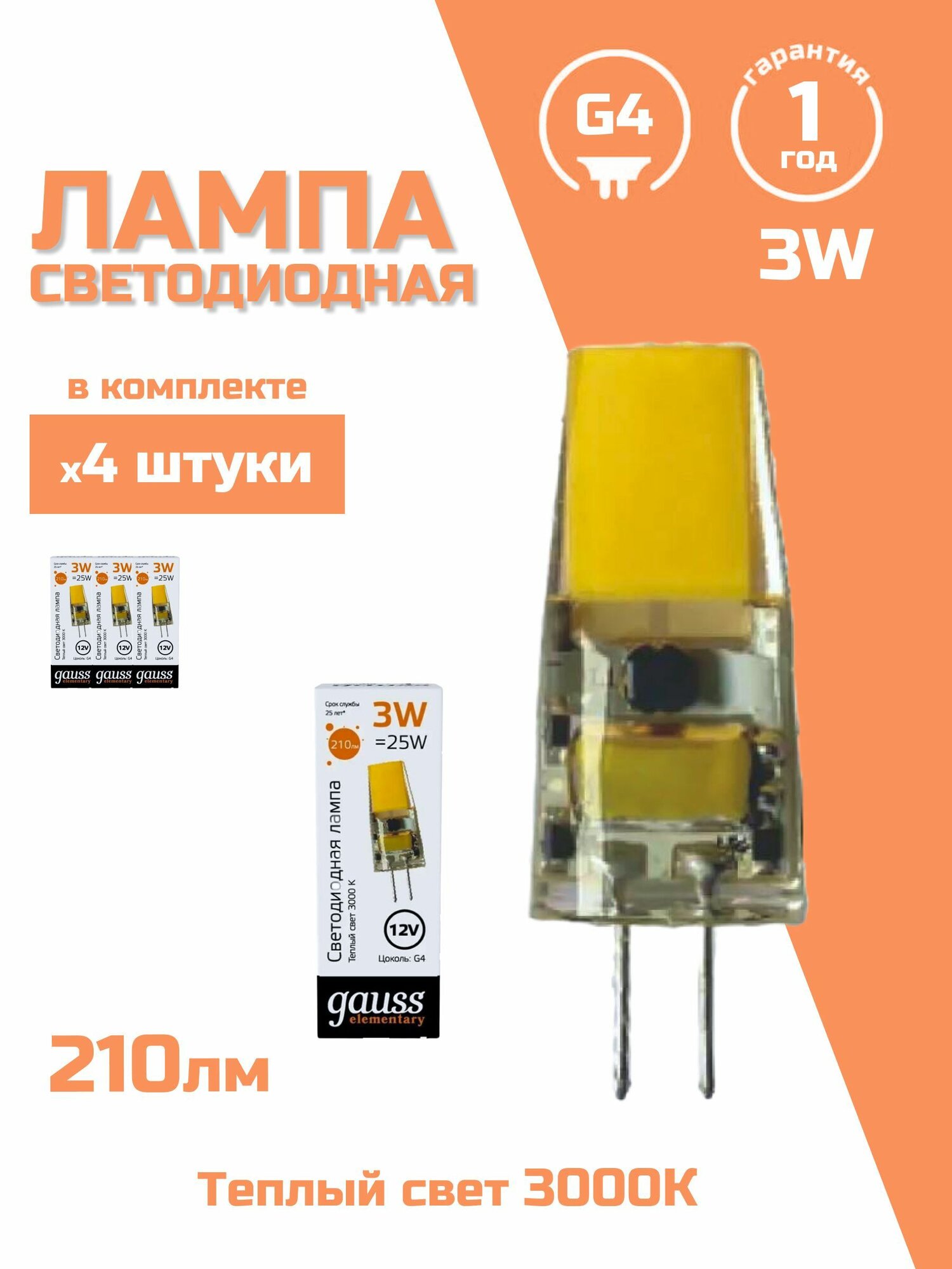 Светодиодная лампа Gauss Elementary G4 12V 3W 250lm 3000K силикон LED 1/20/200