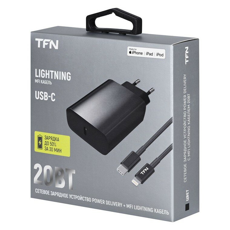 Сетевое зарядное устройство TFN Type-C PD 20W+кабель MFI Lightning (Черный)