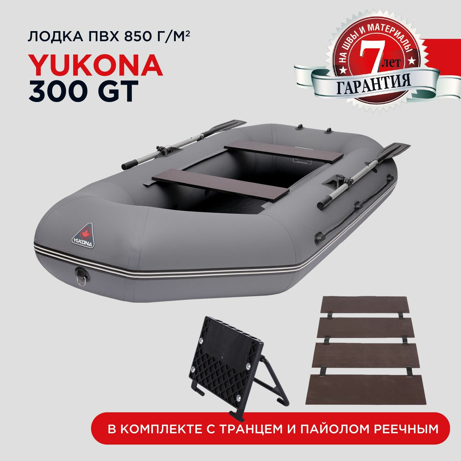 Надувная гребная лодка ПВХ YUKONA 300 GT под мотор с реечным фанерным пайолом, серая