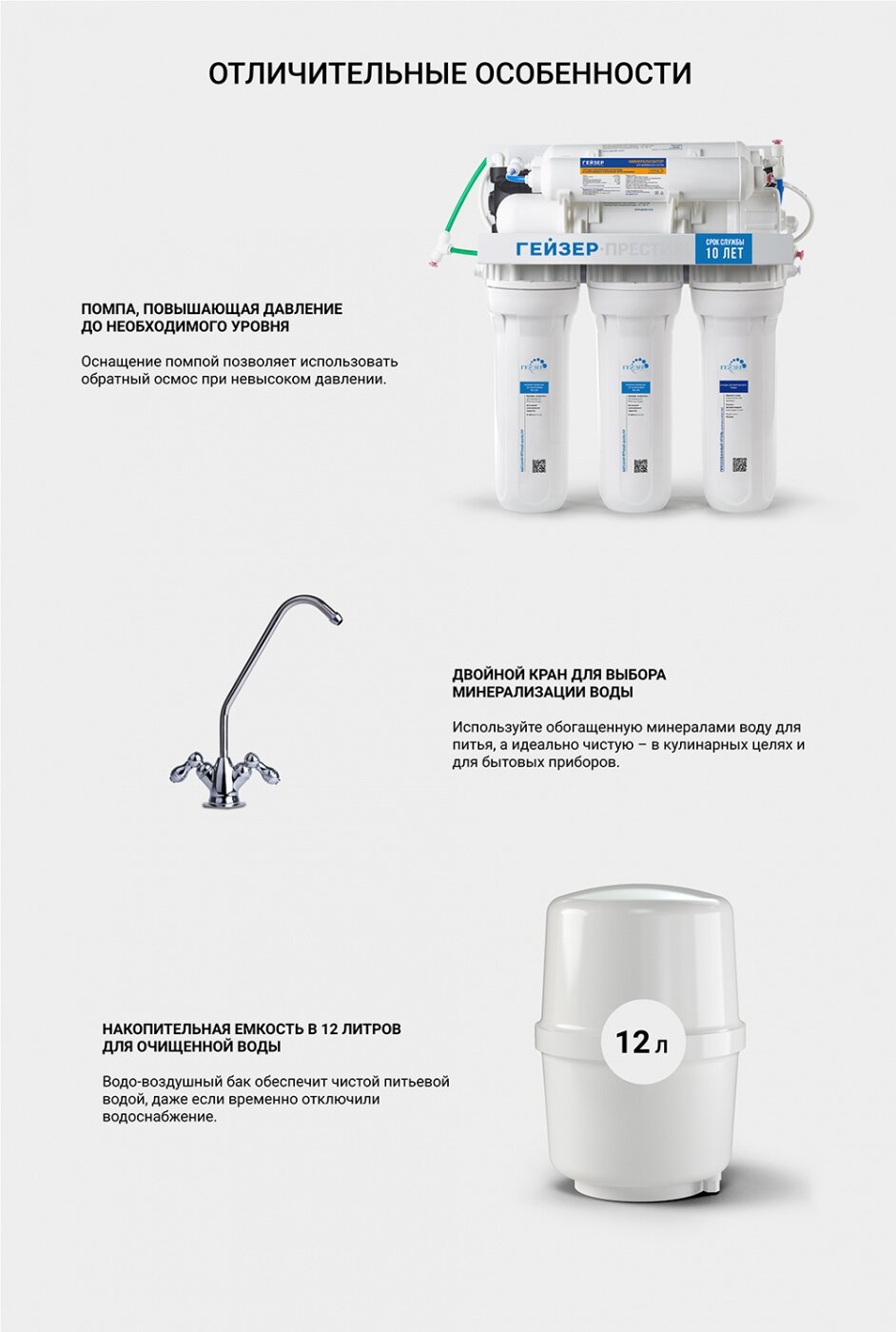 Система обратного осмоса Гейзер Престиж ПМ с помпой и минерализатором (бак 12 л) с краном интересное: