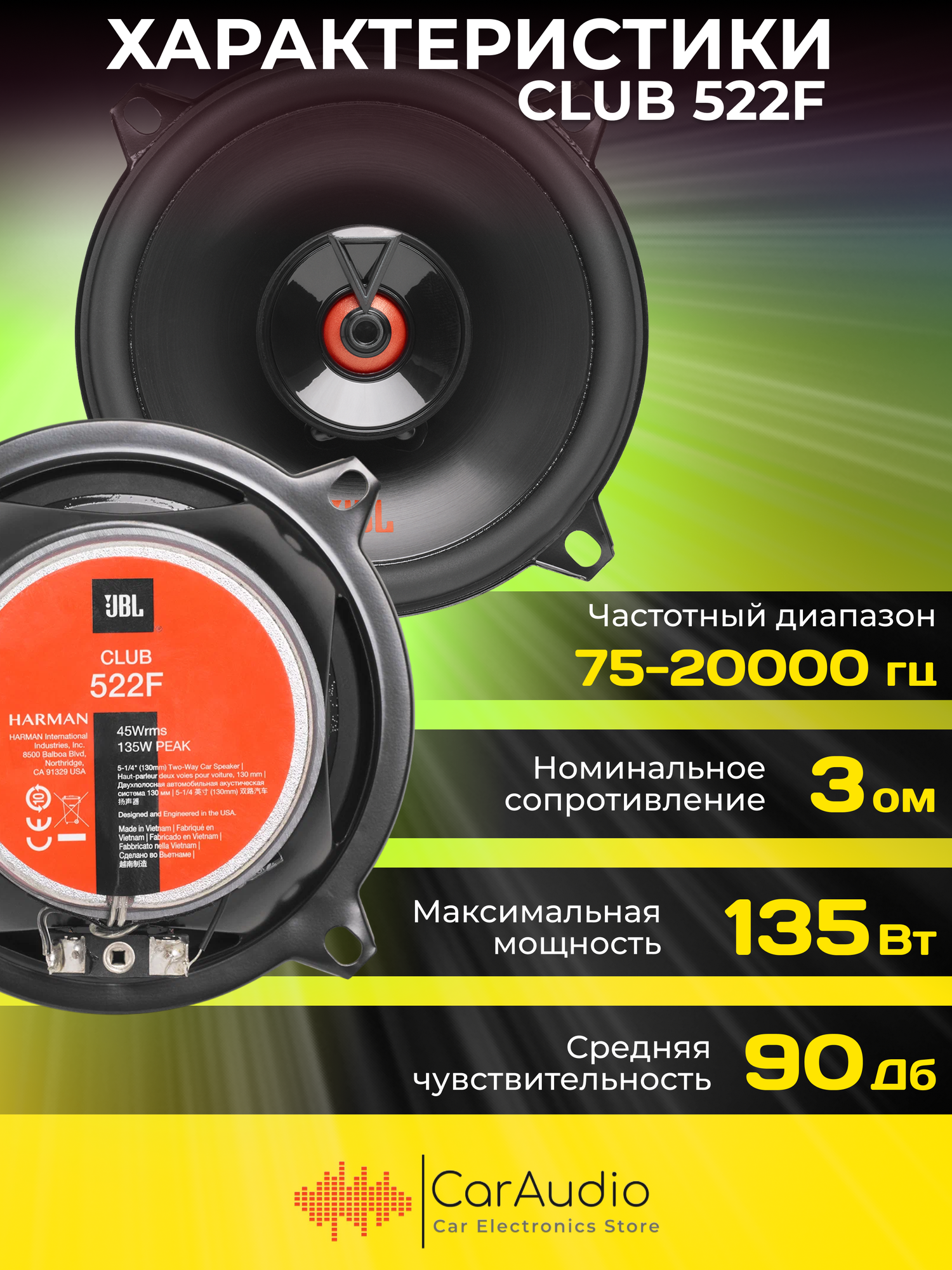 JBL CLUB 522F 2-х полосная акустика 13см, RMS/max: 45/135 Вт, 3 Ом, 75-20000 Гц, 91 дБ, диффузор НЧ интересное: