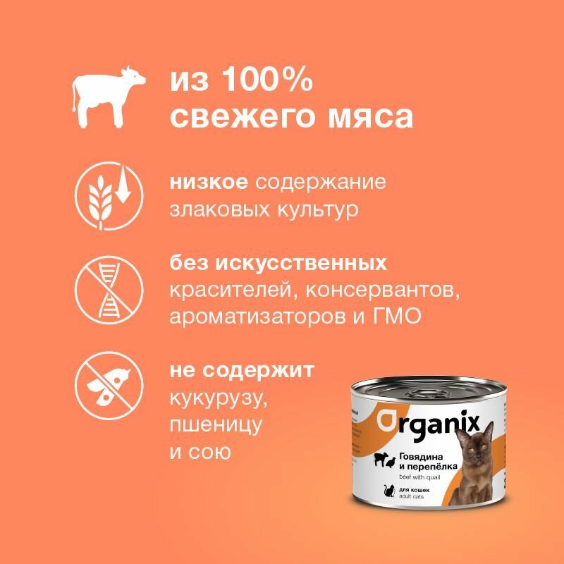 Влажный корм для кошек ORGANIX с говядиной, с перепелкой 100 г (паштет)