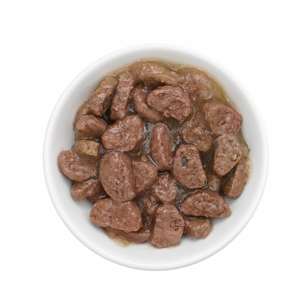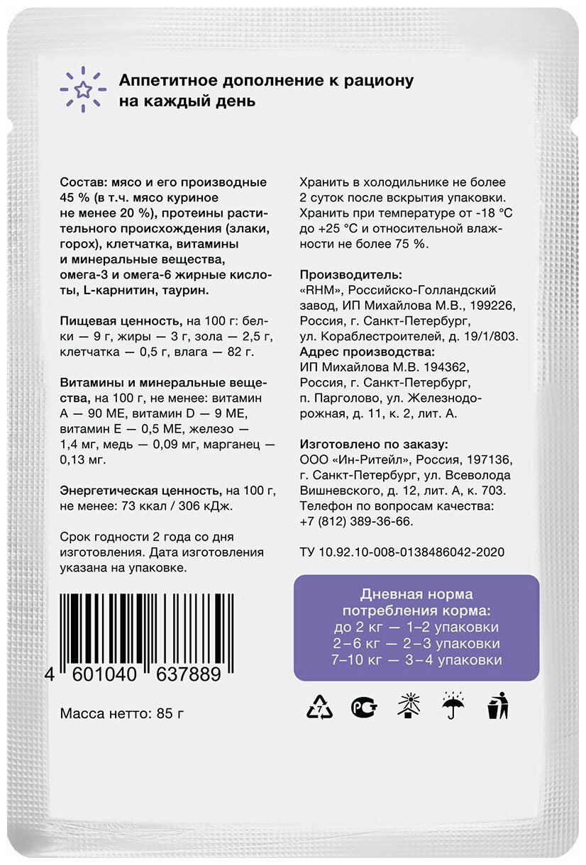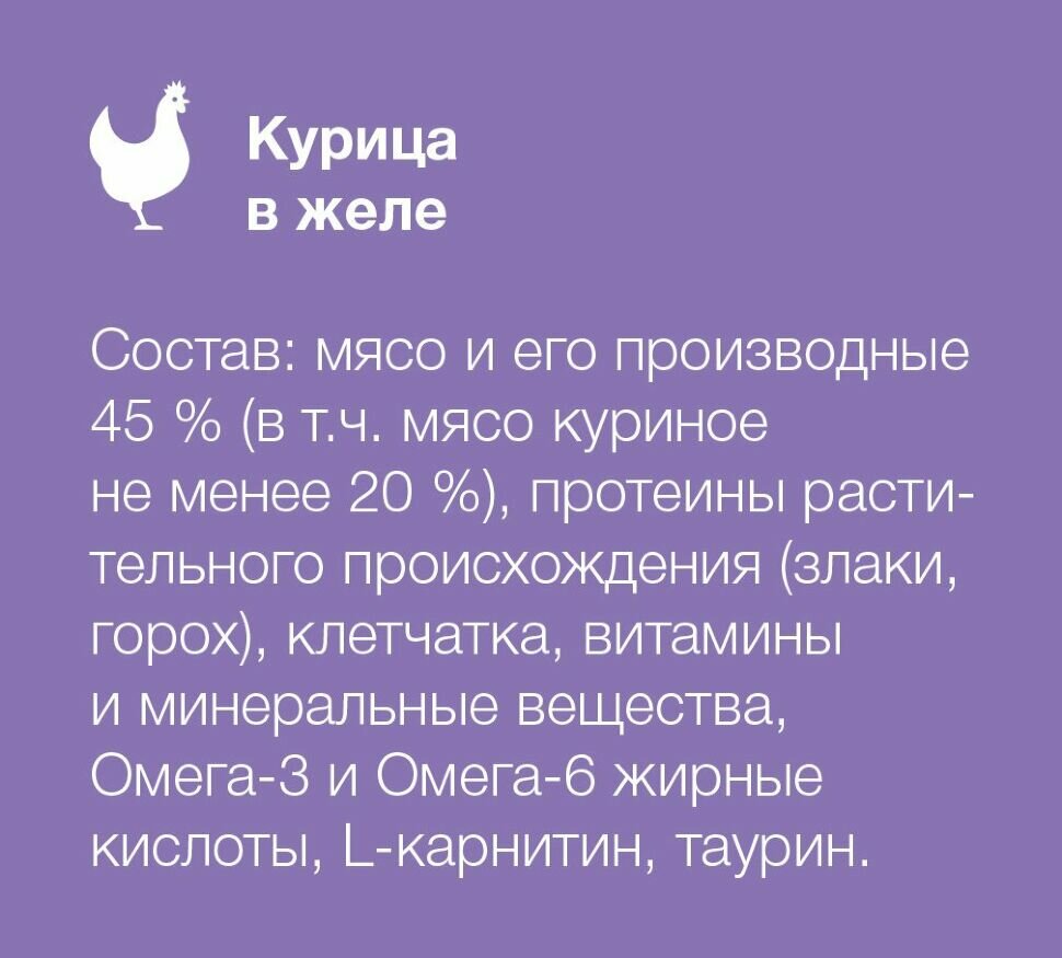 | Состав | мясо и его производные – 45 % (в т.ч. куриное не менее – 20 %), протеины растительного происхождения (злаки, горох), клетчатка, витамины и минеральные вещества, омега-3 и омега-6 жирные кислоты, таурин, L-карнитин |
