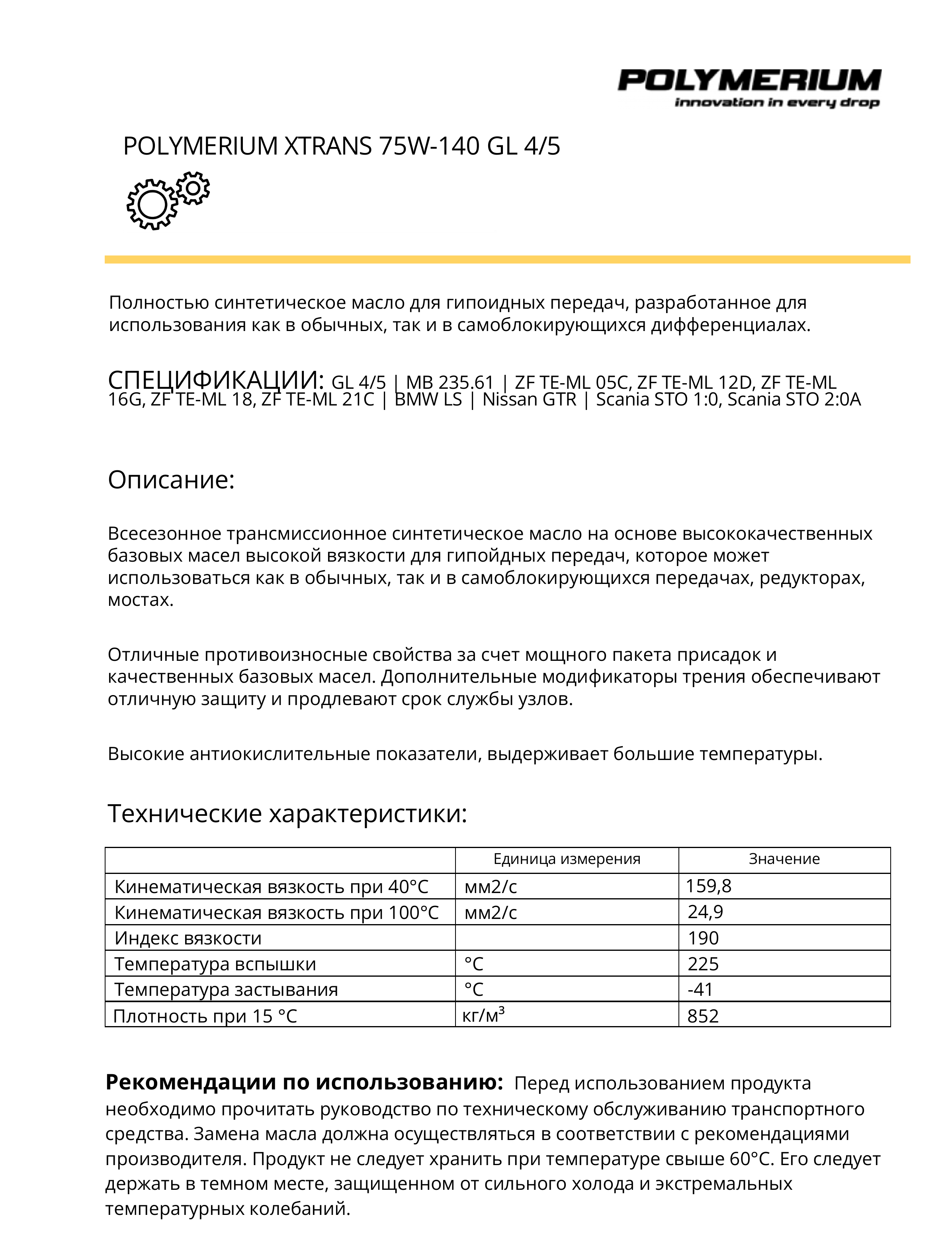 POLYMERIUM XTRANS 75W-140 GL4/5 синтетика 1л интересное: