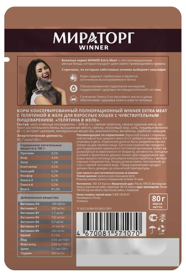 Купить Корм влажный Мираторг Winner Extra Meat для взрослых кошек с чувствительным пищеварением, телятина в желе, 80 г