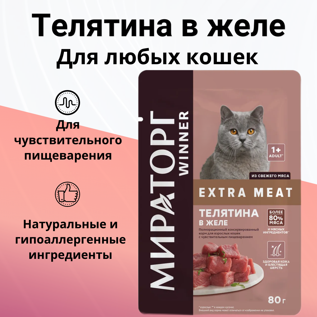 Корм влажный мираторг Winner Extra Meat для взрослых кошек с чувствитвительным пищеварением "Телятина в желе", 24шт х80 г
