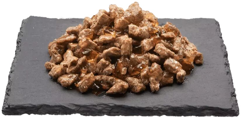 | Состав | мясные кусочки (мясо и субпродукты (в том числе курица более 60% и говядина), минеральные вещества, витамины, мякоть сахарной свеклы, таурин) и желе (вода, аминокислоты, загустители, сахара |