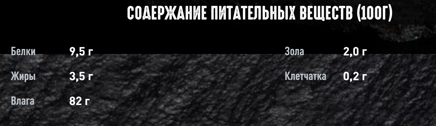 | Пищевая ценность | белки - 9,5 г; зола - 2,0 г; жиры - 3,5 г; клетчатка - 0,2 г; влага - 82 г |