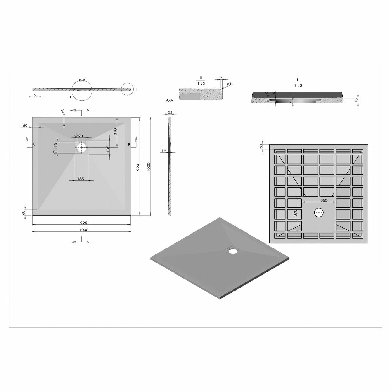 River Поддон для душа WEMOR 70/14 S квадратный 700*700*140 мм, с сифоном