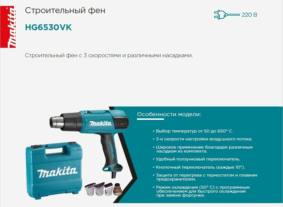 Фен строительный сетевой MAKITA HG 6530 VK интересное: