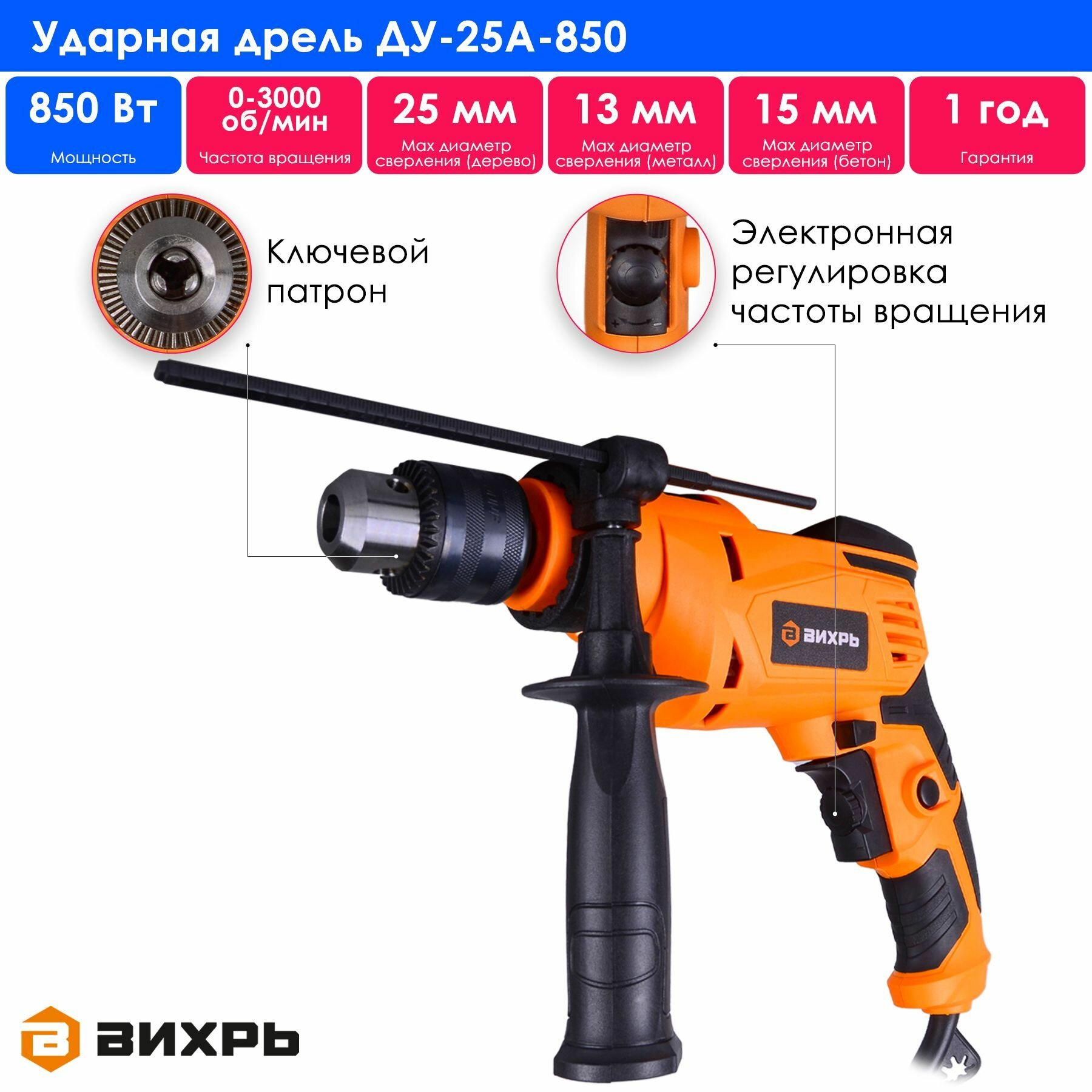 Дрель ударная сетевая ДУ-25А-850 Вихрь, 850Вт, ключевой патрон,реверс