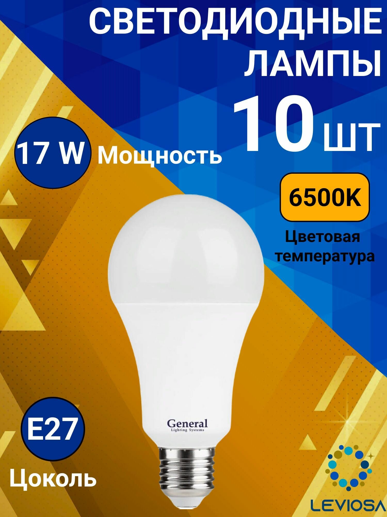 (10 шт.) Светодиодная лампочка General ЛОН A60 E27 17W 6500K 6K 60x110 пластик/алюмин. 637500 Холодный белый. Цоколь E27