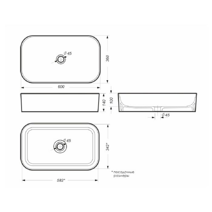 Раковина Sanita "Novel Slim" 60x35x11,2 см, накладная, прямоугольная, белая, фарфор