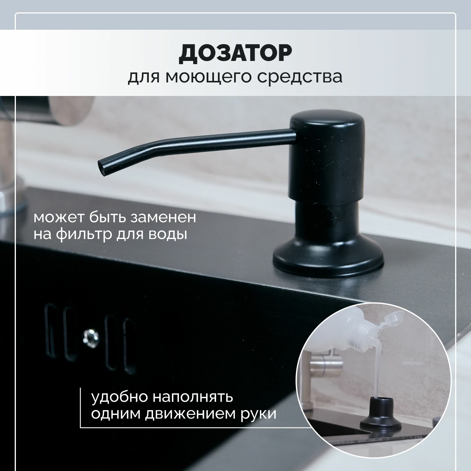 | Особенности | PVD покрытие / дозатор для мыла / коландер / отверстие под смеситель / сливная арматура |