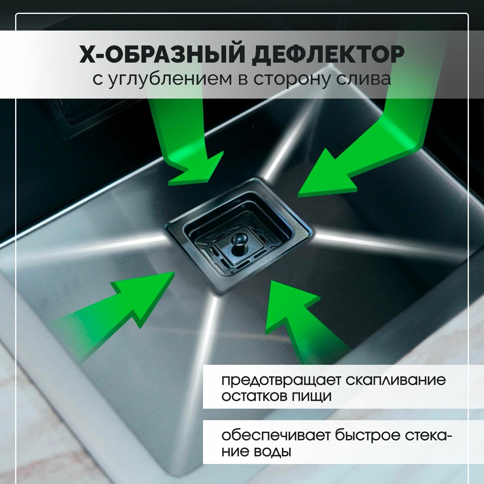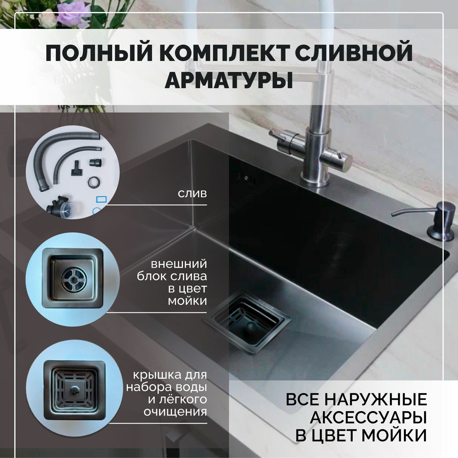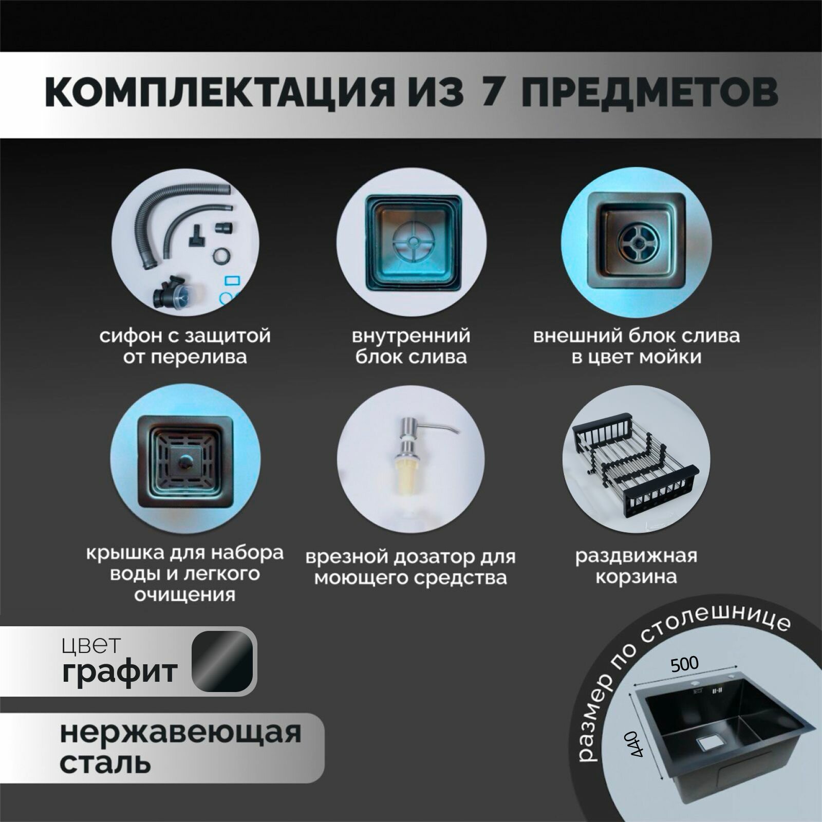 Мойка для кухни с квадратным сливом в цвет мойки 50х44х21,нержавеющая сталь, графит интересное: