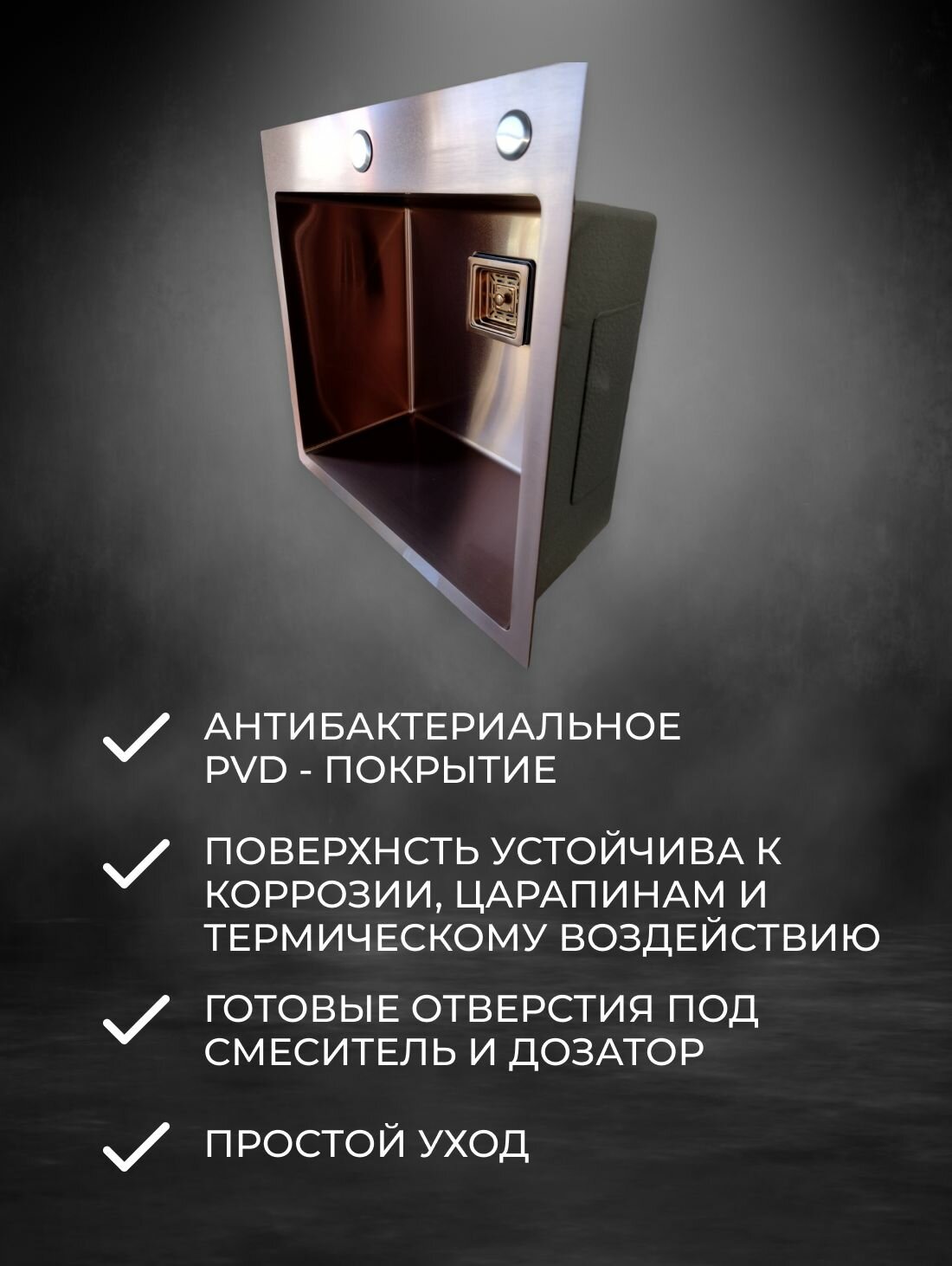 Мойка для кухни с квадратным сливом в цвет мойки 50х50х21,нержавеющая сталь,цвет розовое золото интересное: