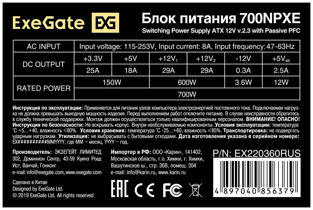 Блок питания ExeGate EX220360RUS, 700 Вт, ATX, 80 PLUS, черный