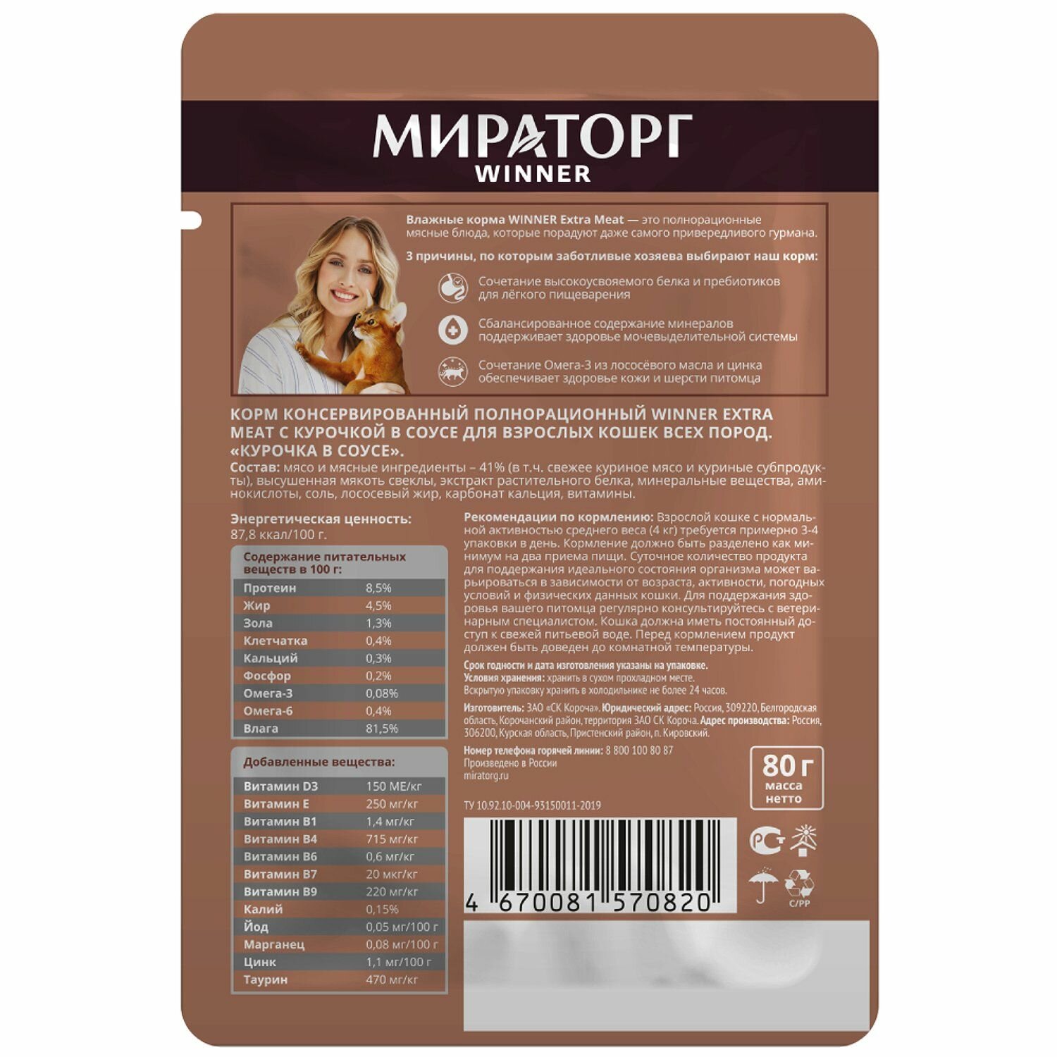 Корм влажный мираторг Winner Extra Meat для взрослых кошек всех пород с курицей в соусе, 24шт х80 г