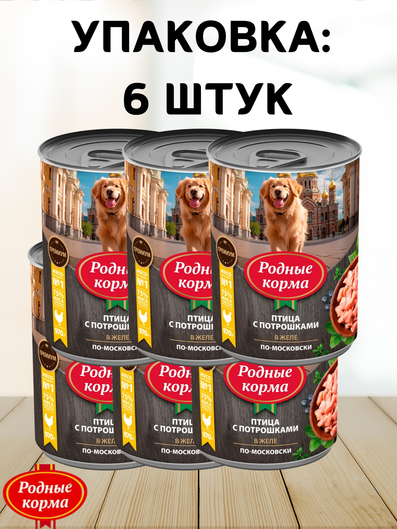 Купить Родные корма консервы для собак Птица с Потрошками в Желе-По Московски 6х970г