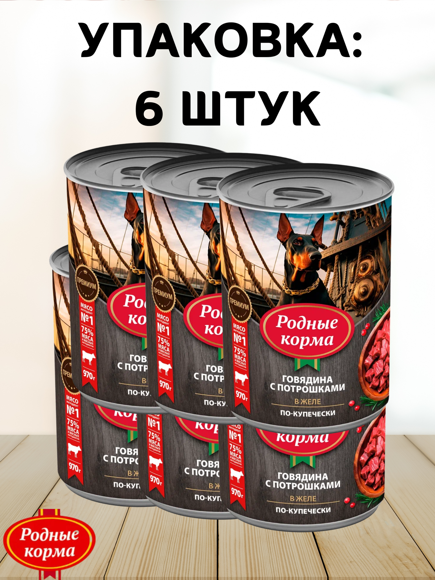 Купить Консервы для собак говядина с потрошками в желе по-купечески, родные корма, 6 штук по 970 г