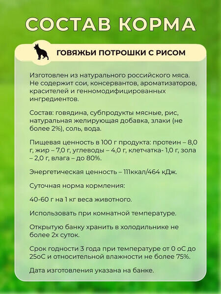 | Состав | мясо птицы, субпродукты, натуральная желирующая добавка, злаки (не более 2%), соль, вода |