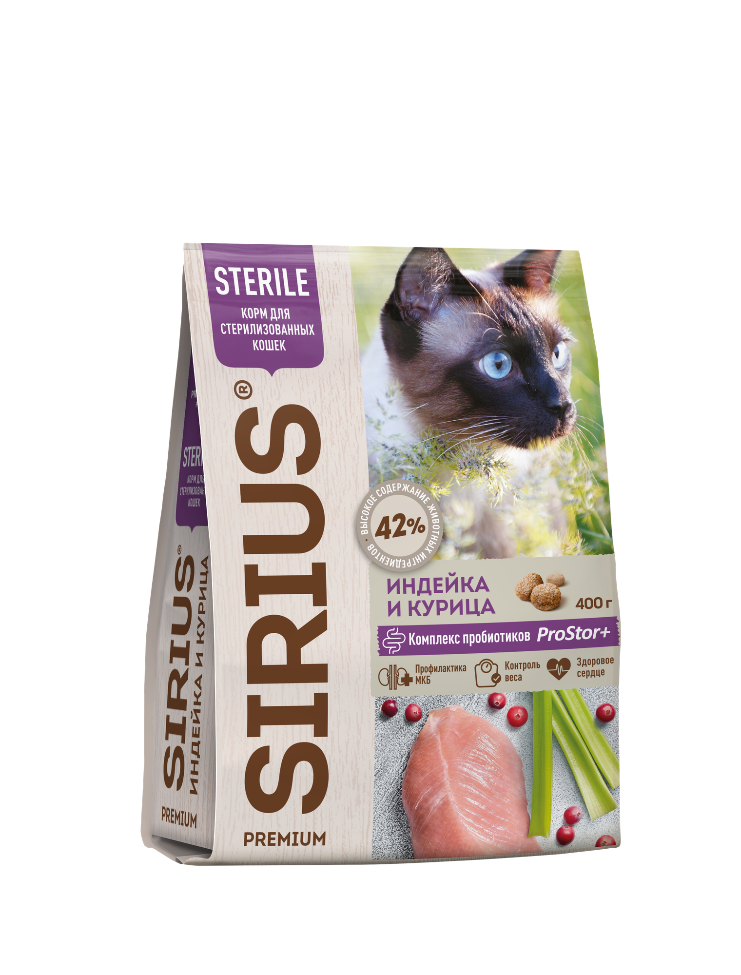 SIRIUS/Полнорационный сухой PREMIUM корм для стерилизованных кошек, Утка и клюква, 0.4 кг