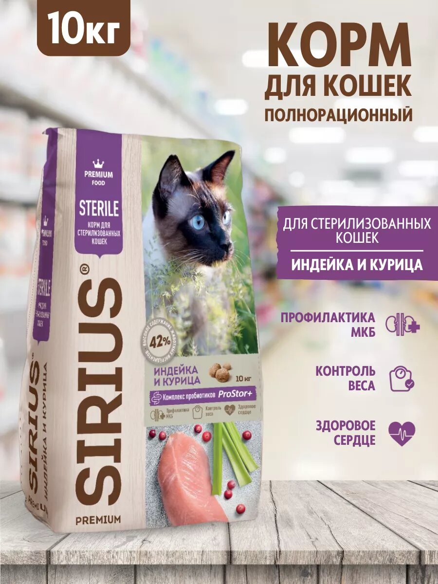 Купить Сухой корм для стерилизованных кошек и кастрированных котов SIRIUS, индейка и курица, 10 кг