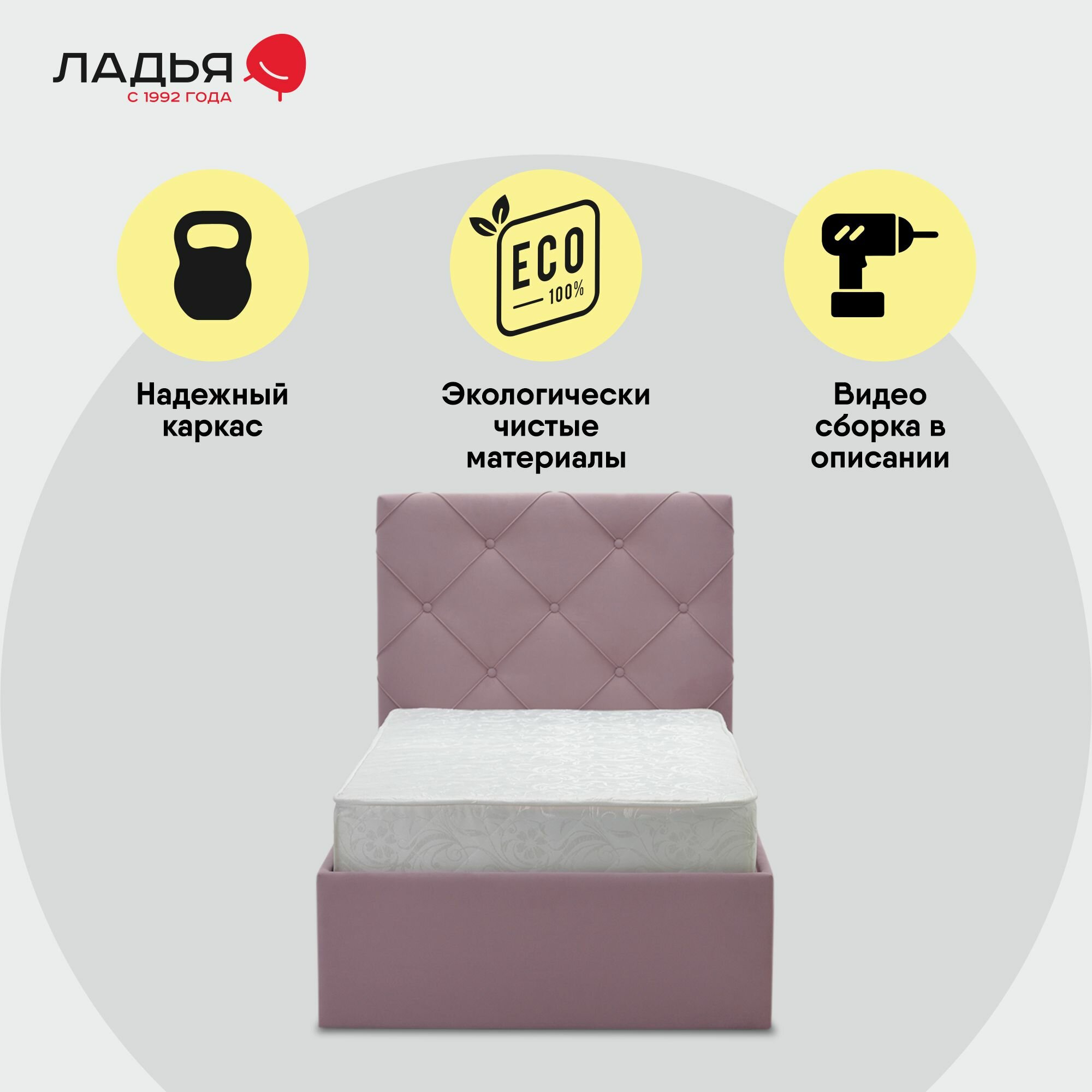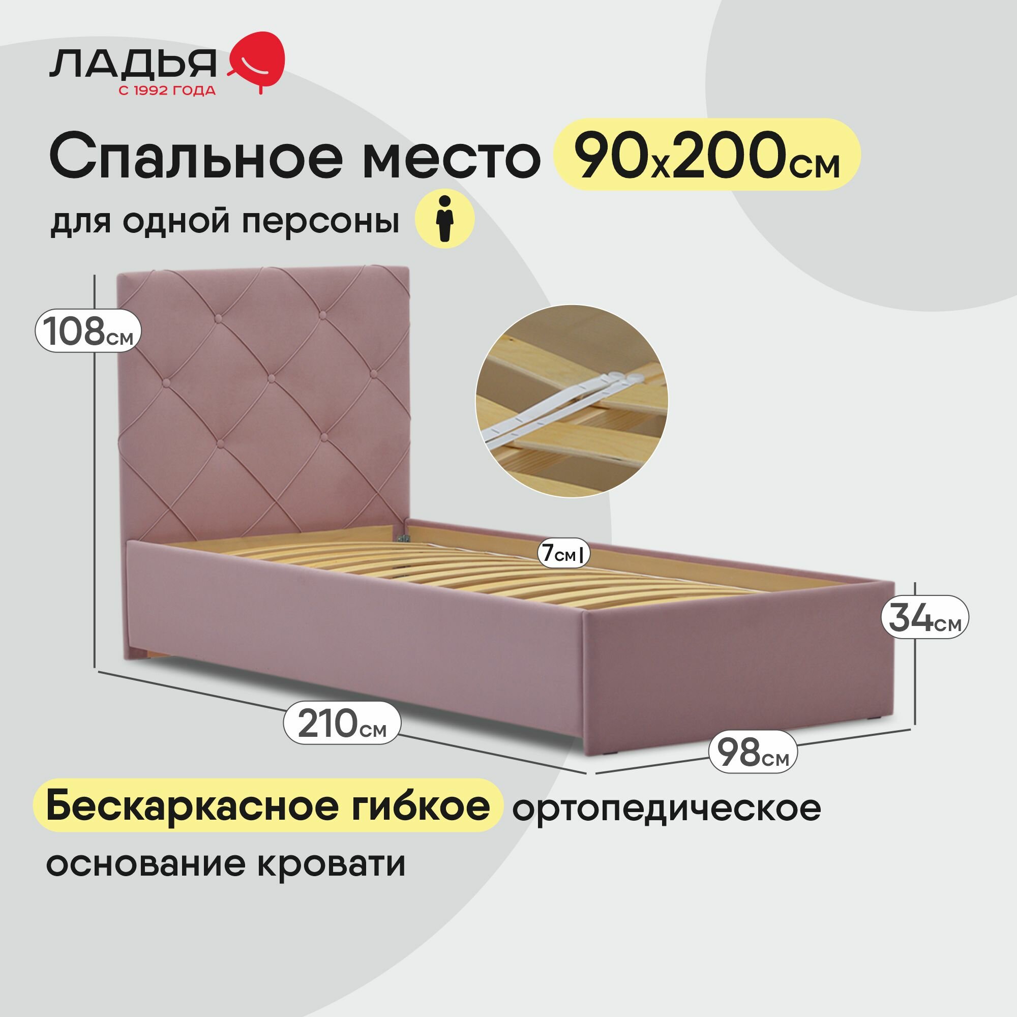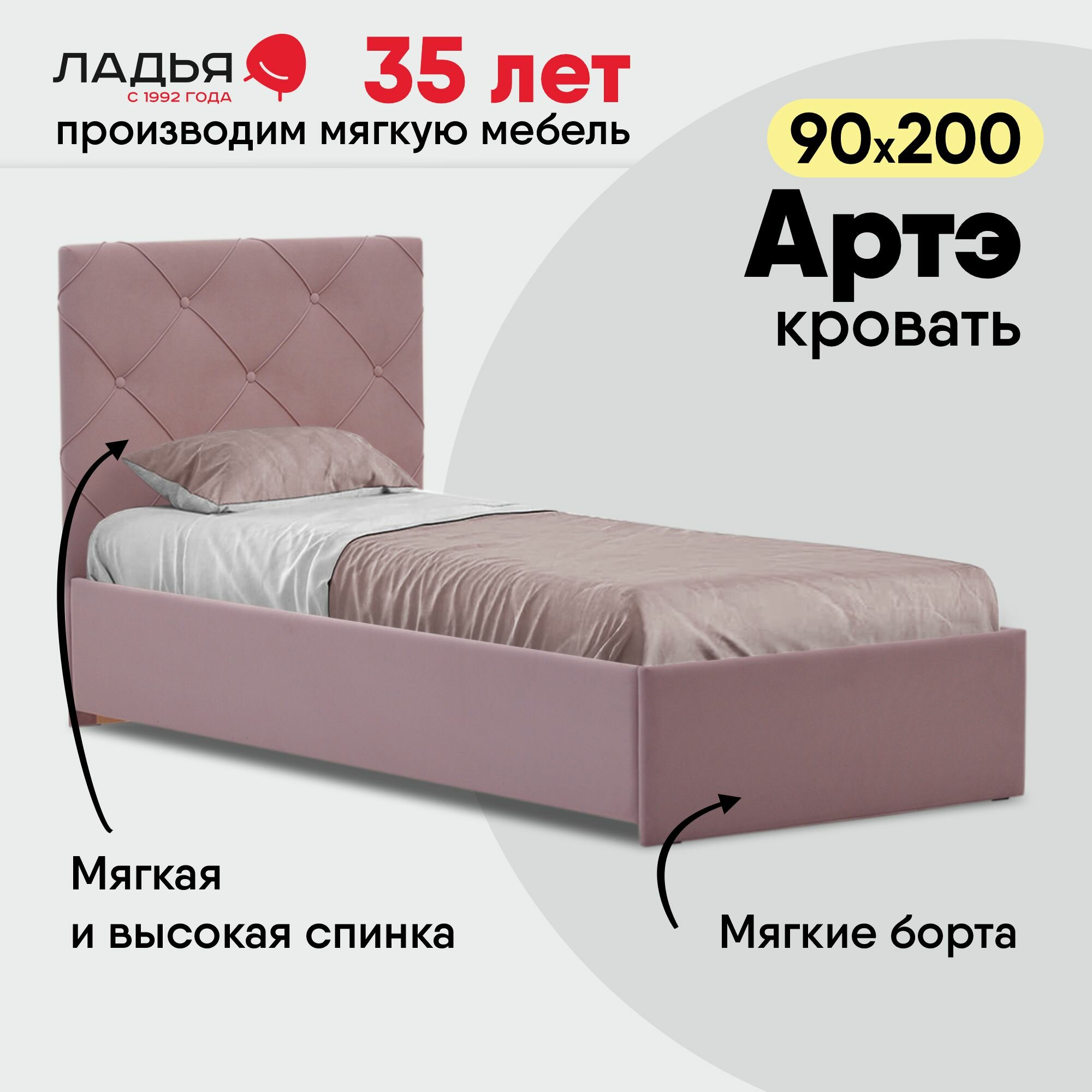 Односпальная кровать Артэ 90х200, с мягким изголовьем для дома и спальни, Ладья, ортопедическое основание, Evita 13