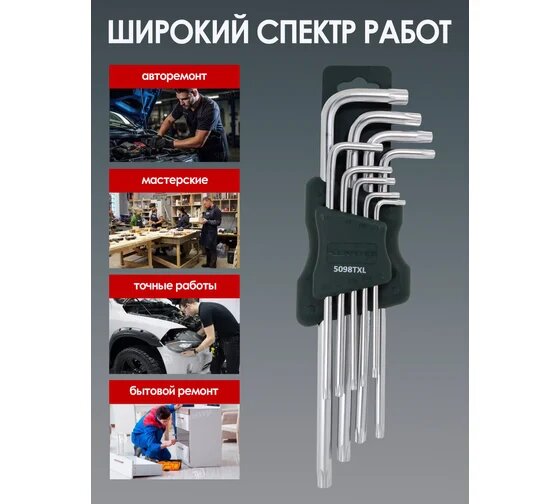 Набор ключей Г-образных TORX экстра длинных, 9пр. (Т10Н, Т15Н, Т20Н, Т25Н,Т27Н, Т30Н, Т40Т, Т45Н,Т50Н с отверстием) в пластиковом держателе Rock FORCE RF-5098TXL
