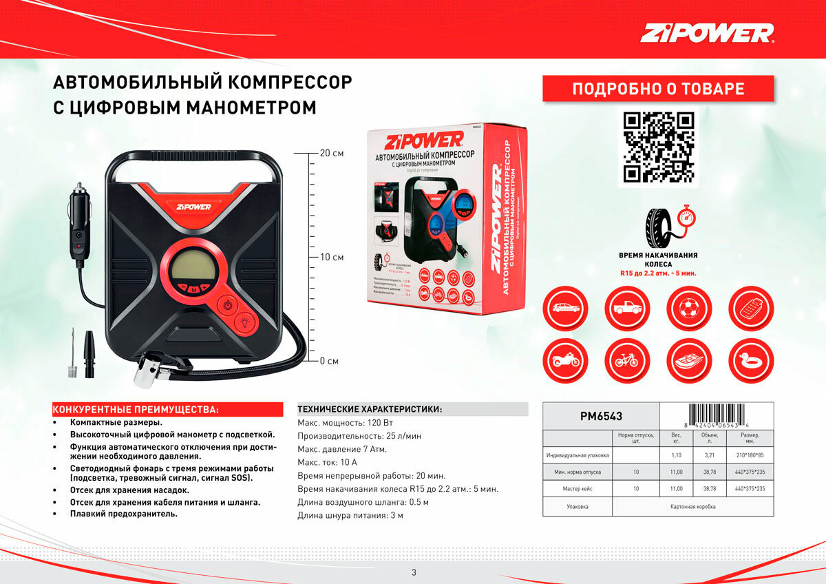 ZIPOWER PM6543 Компрессор автомобильный с цифровым манометром Zipower интересное: