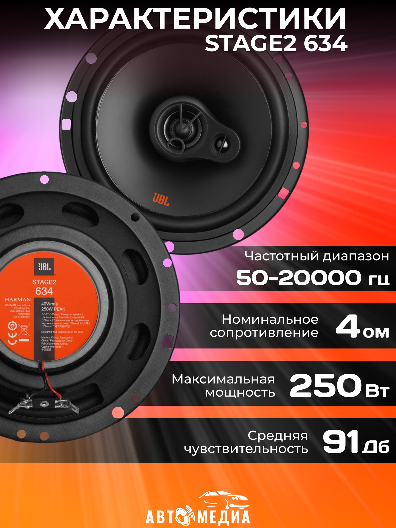 Колонки автомобильные JBL Stage2 634 250Вт 91дБ 4Ом 16см (6.5дюйм) (ком.:2кол.) коаксиальные трехпол интересное: