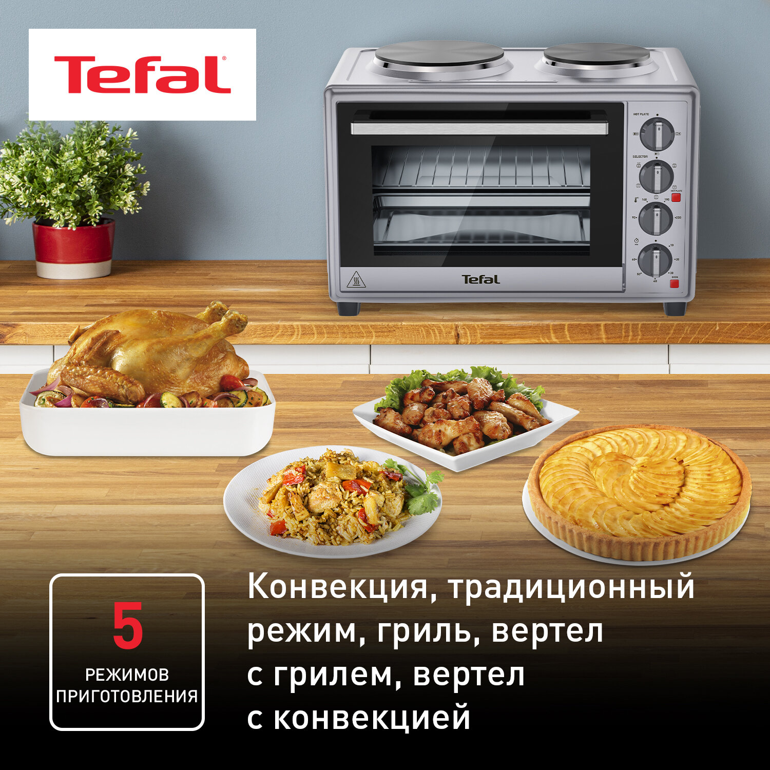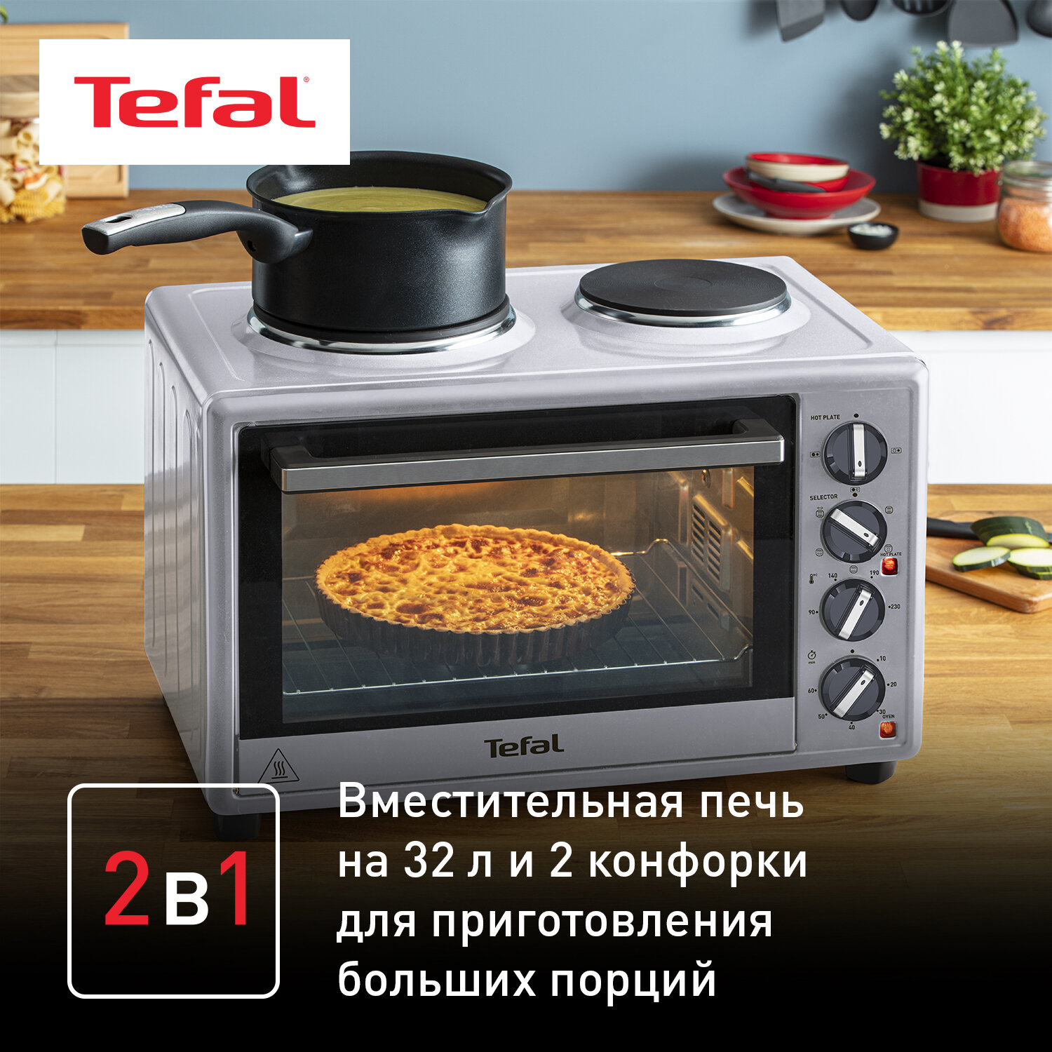 Мини-печь Tefal Optimate OF463D30, 32 л, с 2 конфорками, грилем и конвекцией, подсветкой, 3000 Вт, серебристая интересное: