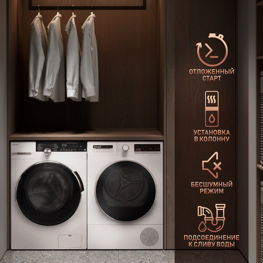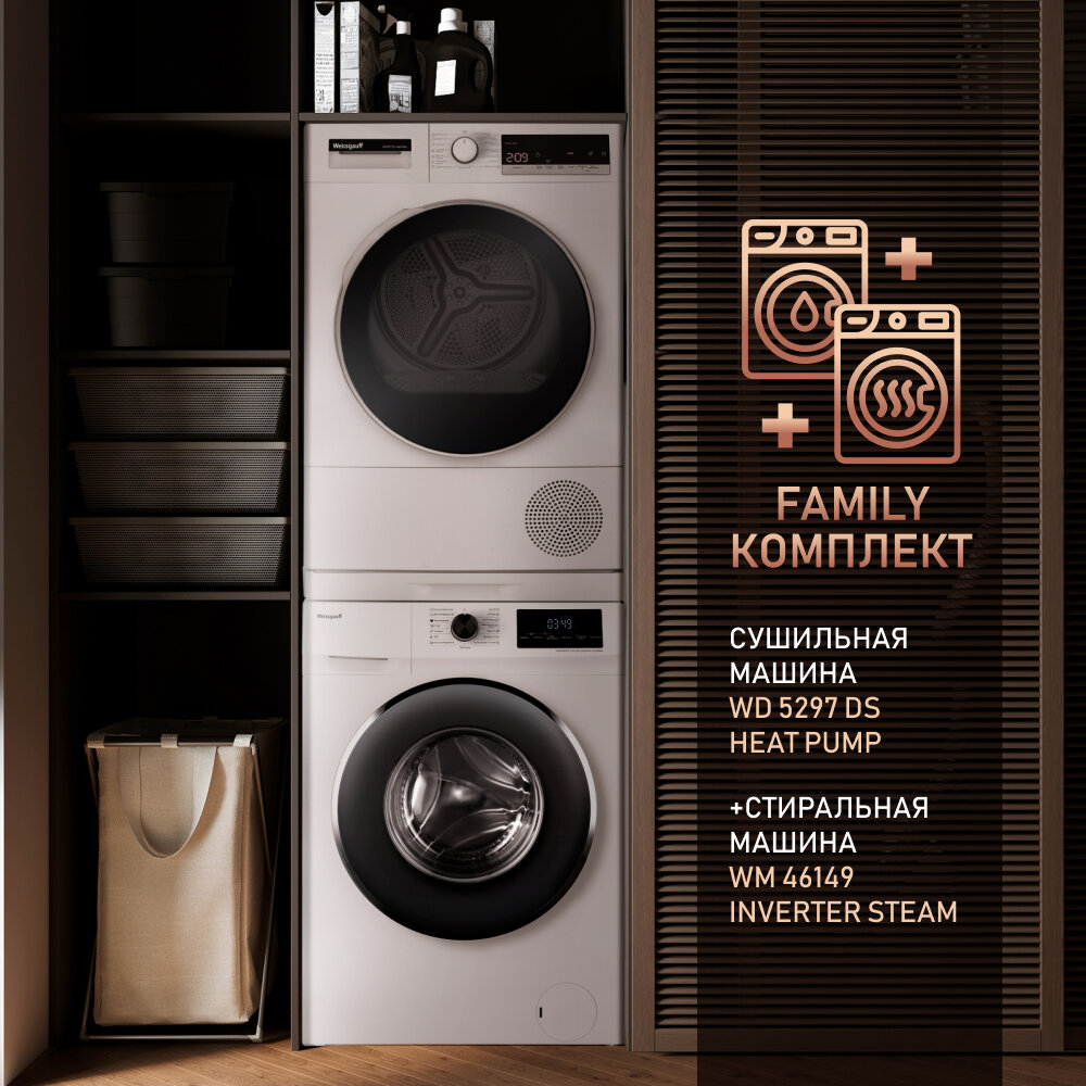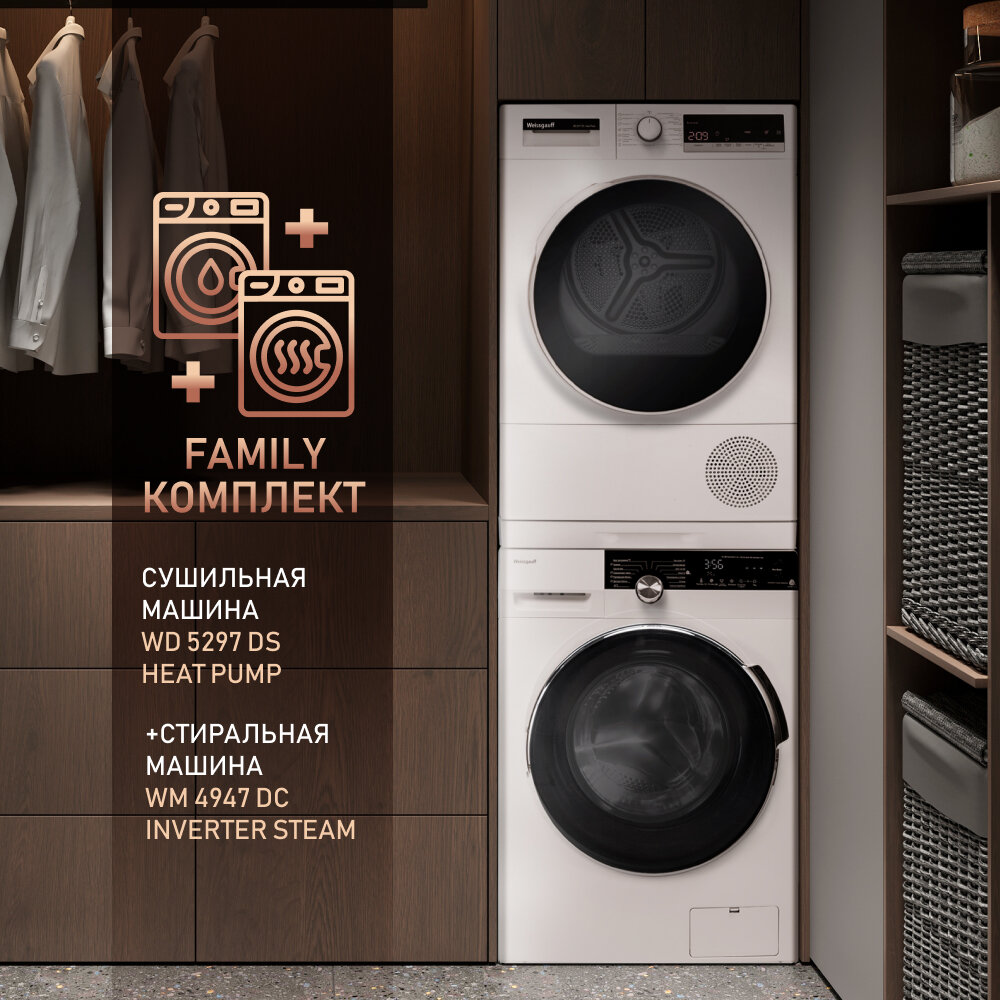 Сушильная машина Weissgauff WD 5297 DS Heat Pump,узкая, Подсветка барабана, Установка в колонну интересное: