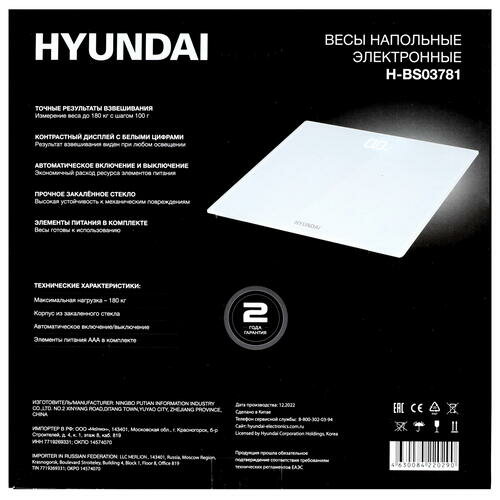 Напольные весы HYUNDAI H-BS03781, до 180кг, цвет: белый