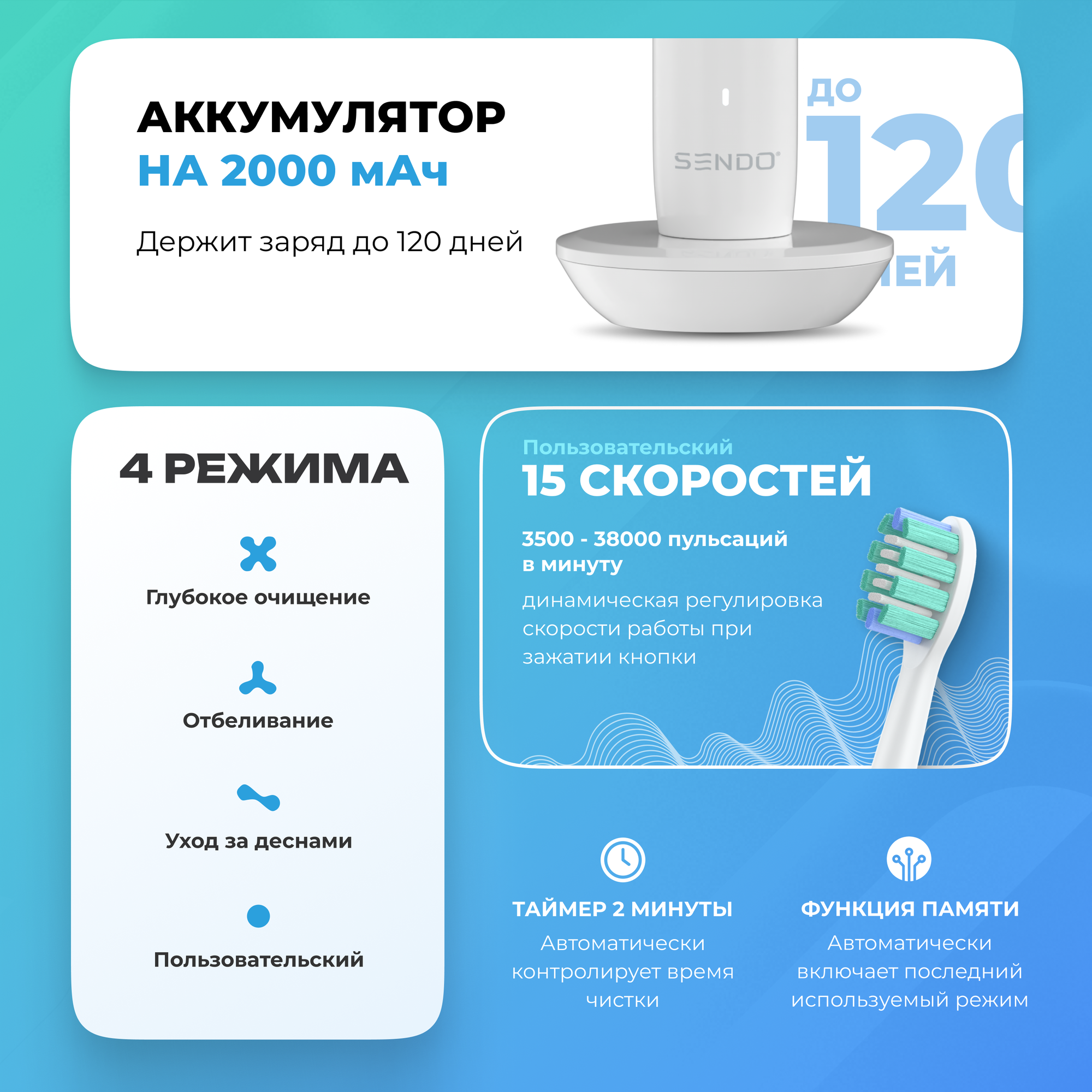 SENDO Электрическая ультразвуковая зубная щетка sonibrush m4, цвет белый sndshM4wh