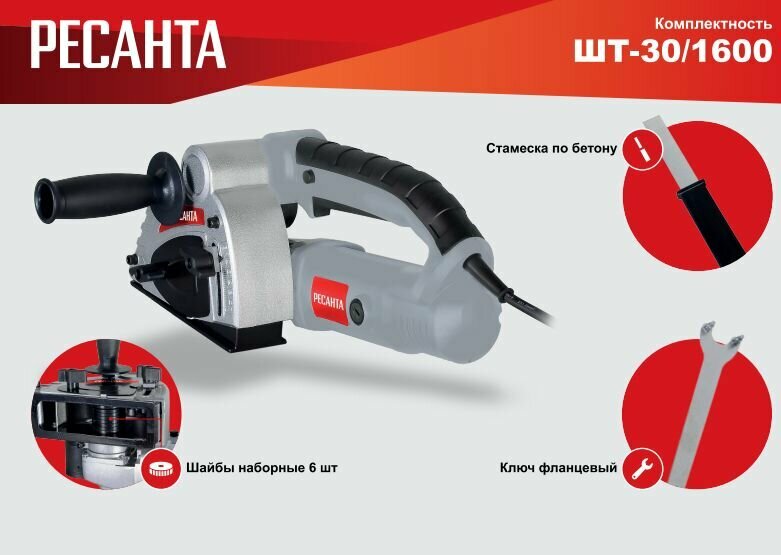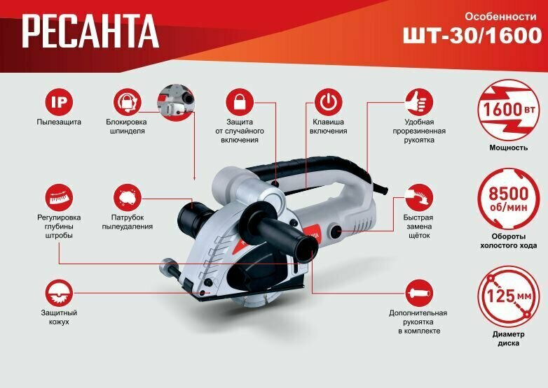 Штроборез Ресанта ШТ-30/1600 8500об/мин 1600W серый/черный, Блокировка шпинделя, Удаление пыли, Плавный пуск