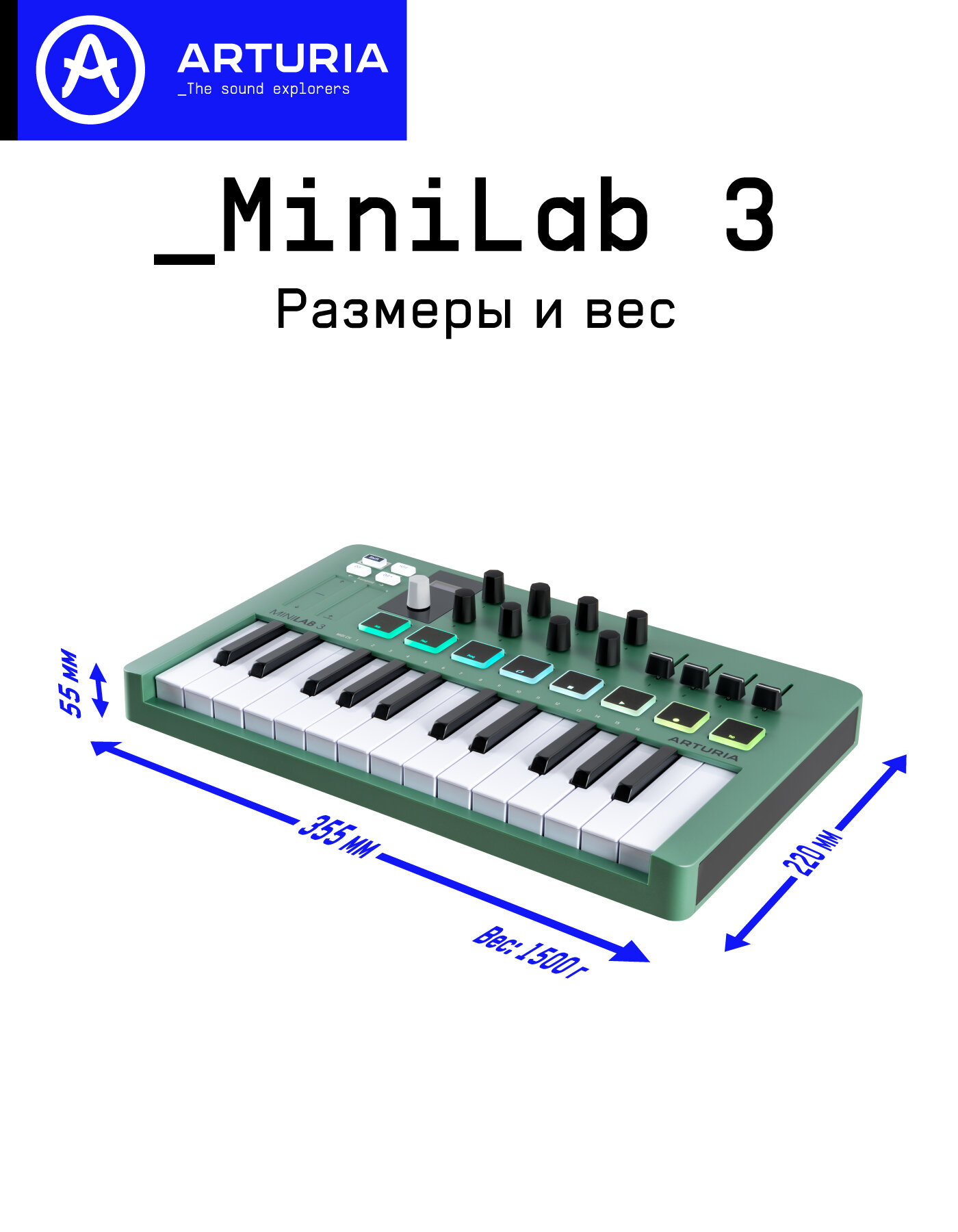 Arturia MiniLAB 3 25 клавишная MIDI-клавиатура - пэд-контроллер, 9 регуляторов, 8 RGB пэдов, 8 фейдеров, дисплей, сенсорные регуляторы Pitch/Modulatio