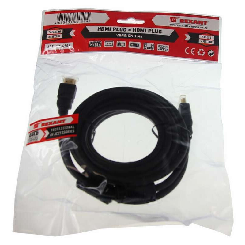 Кабель REXANT HDMI-HDMI 1.4 с фильтрами, 5 м, серия Gold