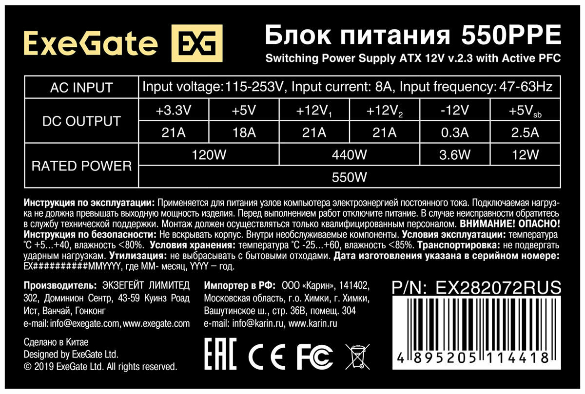 Блок питания Exegate EX282072RUS 550W ExeGate 550PPE, ATX, black, APFC, 12cm, 24p+(4+4)p PCI-E, 3*ID