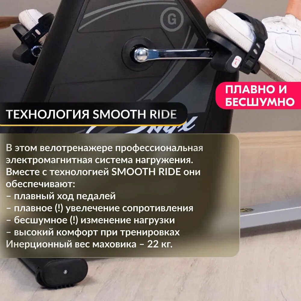 из за конструкции сиденья при сильном педалировании появляется раскачивание(как бы сильно не затягивал винт), именно сиденья, а не всего тренажёра. В середине и под сиденьем упоры резиновые(это плюс) а вот под маховиком где колесики все пластиковое, есть риск поцарапать пол, и чтобы покатать тренажёр надо довольно высоко поднимать зад |