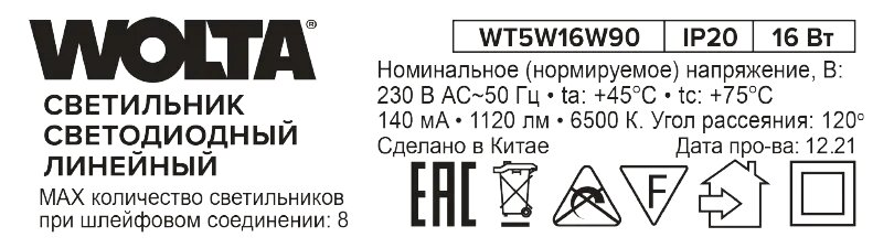 Wolta Светильник светодиодный, 16 Вт, 6500К WT5W16W90
