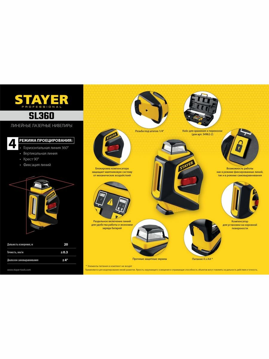 STAYER SL360-2 нивелир лазерный, 20м, крест + 360°, точн. +/-0,3 мм/м, штатив, кейс ( 34962-2 )