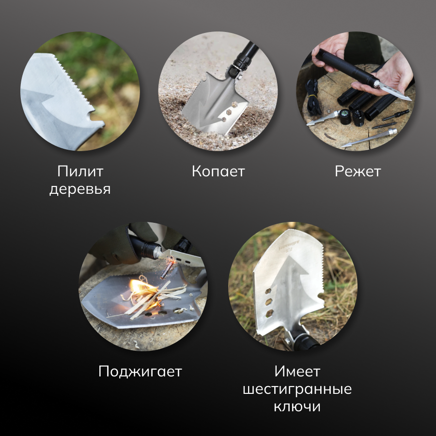 Лопата туристическая Adimanti HK001 17 в 1, многофункциональная, чехол на пояс в комплекте, черный/хром
