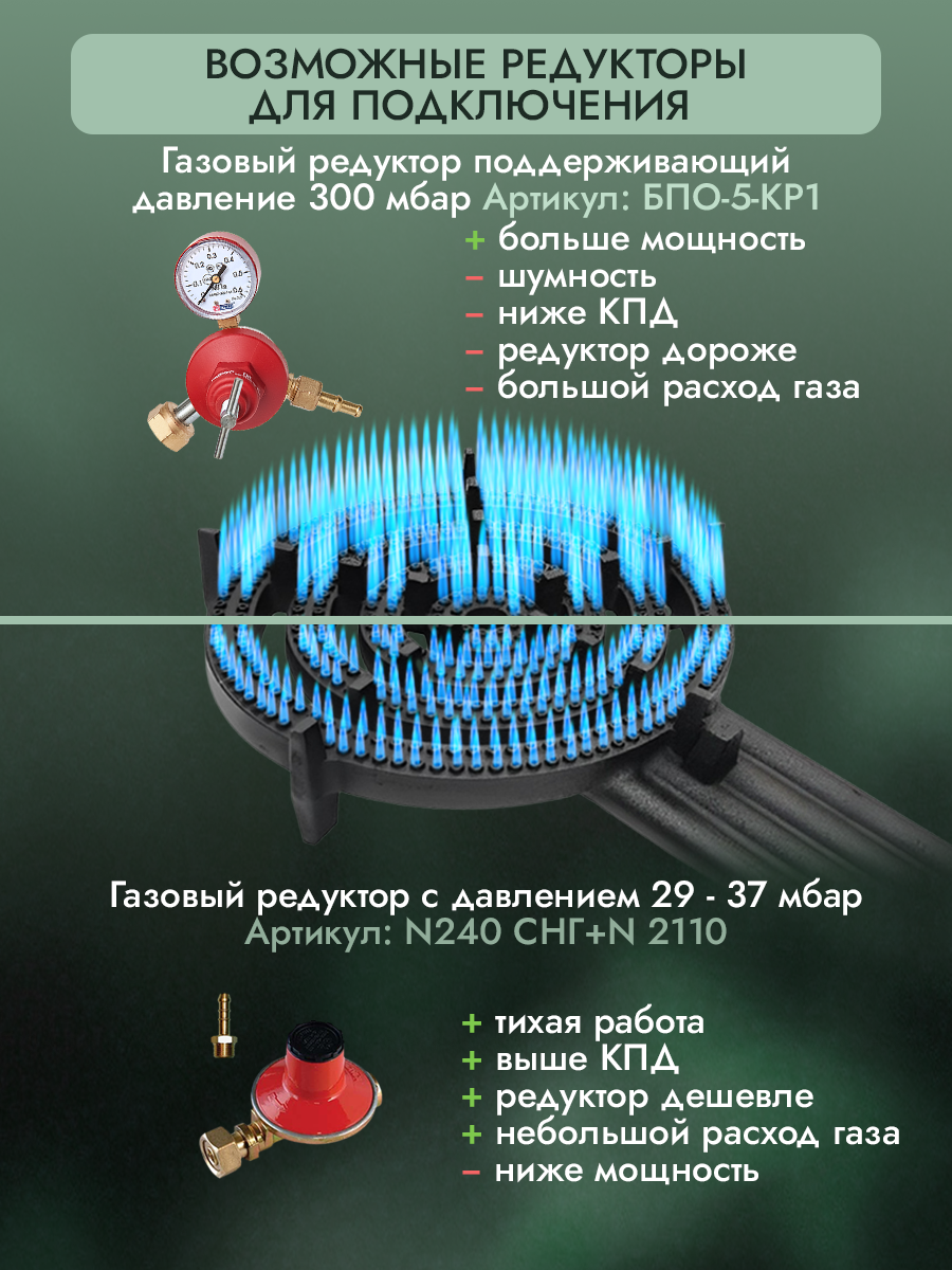 | Дополнительная информация | Подходит только под баллонный газ. Назначение: Встраиваемая / Для печи / Под подставку; расход топлива: 990 г/ч |